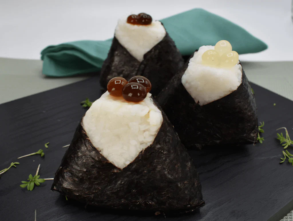 Yuzu Sake Perlen geben den Onigiri zitronige Frische, Ponzu addiert Umami. Selbstverständlich kann man die Perlen auch mischen.