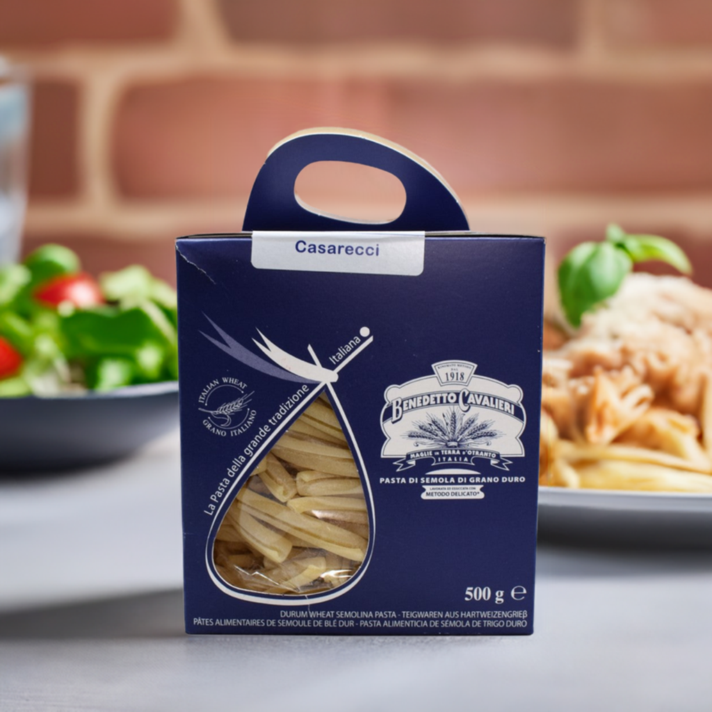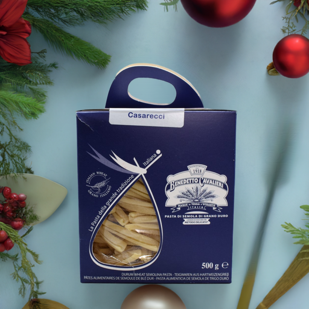 These Casarecci are elaborately produced using a bronze mold. The rough surface of the casarecci absorbs the sauce particularly well. The noodle has a pleasantly strong taste of its own.